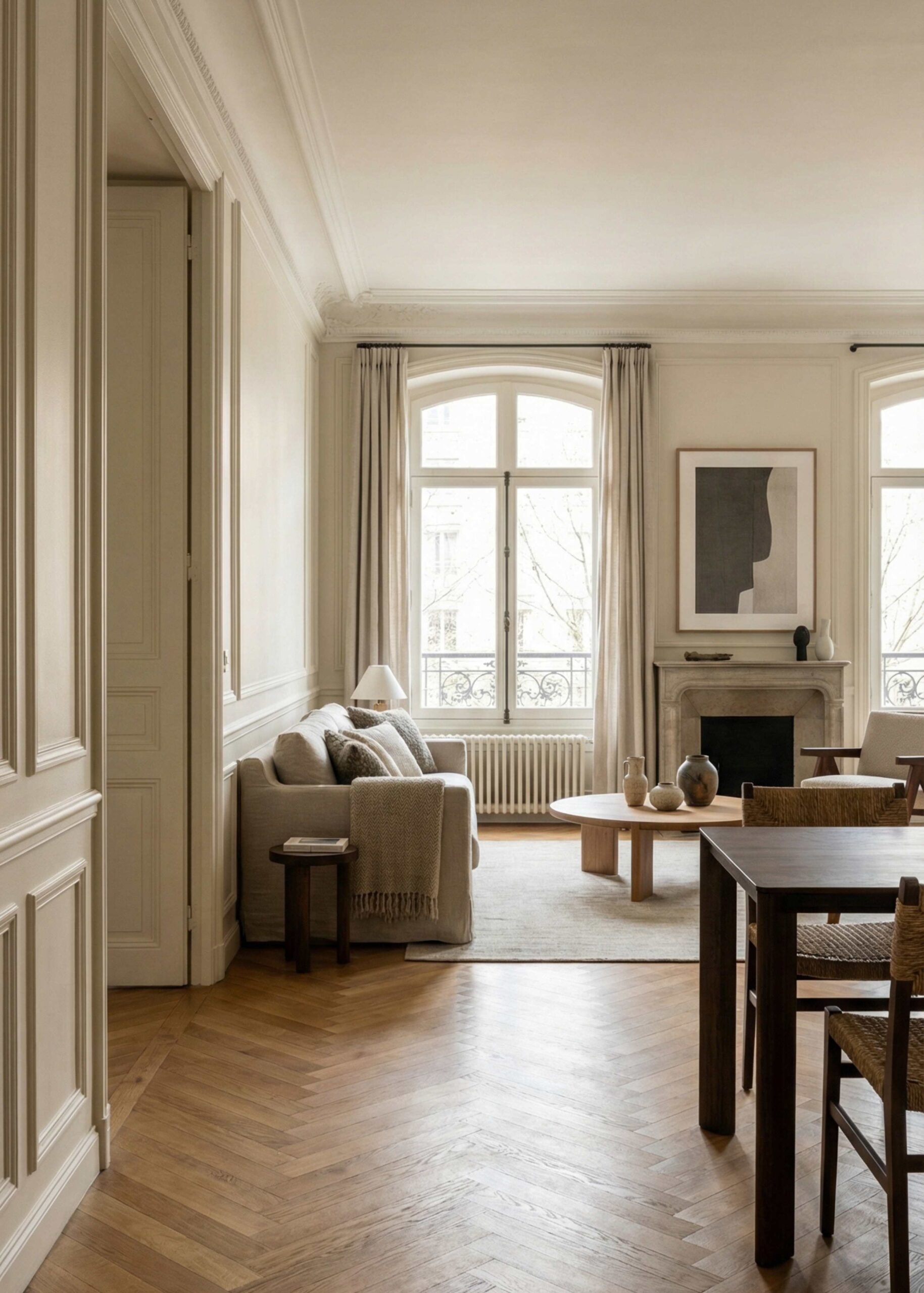 - Mise en valeur des éléments existants (moulures, parquet, volumes)